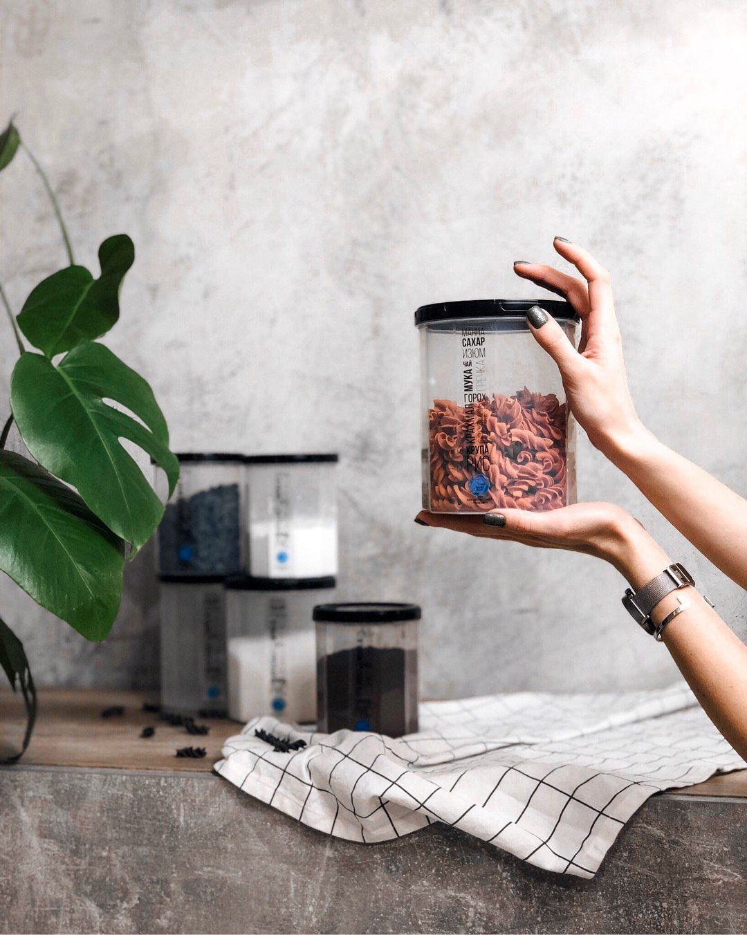 Convenient containers for granulated products help keep your kitchen shelves tidy. It's a great solution for storing flour, cereals, sugar, salt, and other granulated products. The container is hermetic, that protects the contents from dust and moisture. All containers are stylish and practical, easy to wash and do not occupy much space in the kitchen.