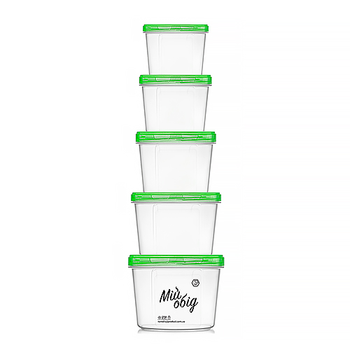 Set of round capacity 0,2 + 0,3 + 0,5 + 0,7 + 1l with a green lid (art. 82g)